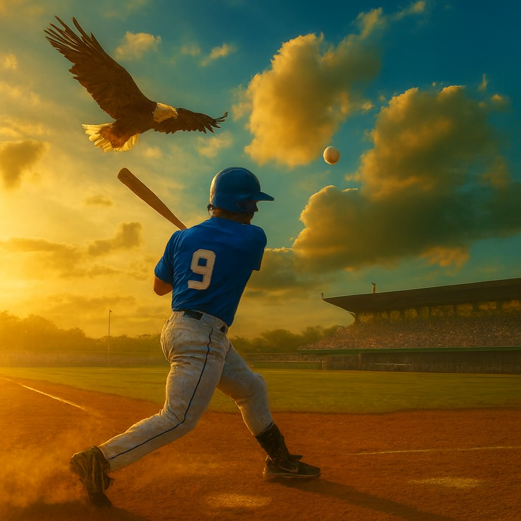 抬頭看見天空,一隻熊鷹正迎風展翅,那是族人世世代代的守護神。 那一刻,他想起部落長老說的話: 「風不是阻力,是助力。懂得借風,球就能飛得更高。」 投手蓄力,球如閃電般射出。場邊球迷的吶喊瞬間靜音,他彷彿置身度外。 一陣風起——心中響起聲音:「就是現在,借風起飛!」 屏息凝神,他揮棒。球棒擊中甜蜜點,劃出完美的弧線。 白色的球像熊鷹振翅氣流上升,借著風的力量,飛過外野,飛過所有質疑,飛進勝利的天空。 全場歡呼,他心裡明白: 「真正的全壘打,就是學會像熊鷹一樣展翅,贏風飛翔。」